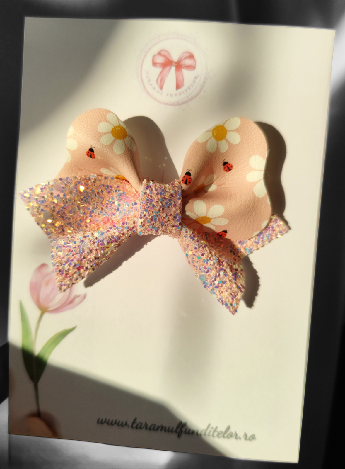 O fundiță delicată, plină de farmec, realizată manual cu multă grijă și atenție la detalii. Combinația dintre materialul pastelat cu margarete și buburuze simpatice și baza glitterată oferă un efect jucăuș, dar elegant, perfect pentru micile domnișoare.