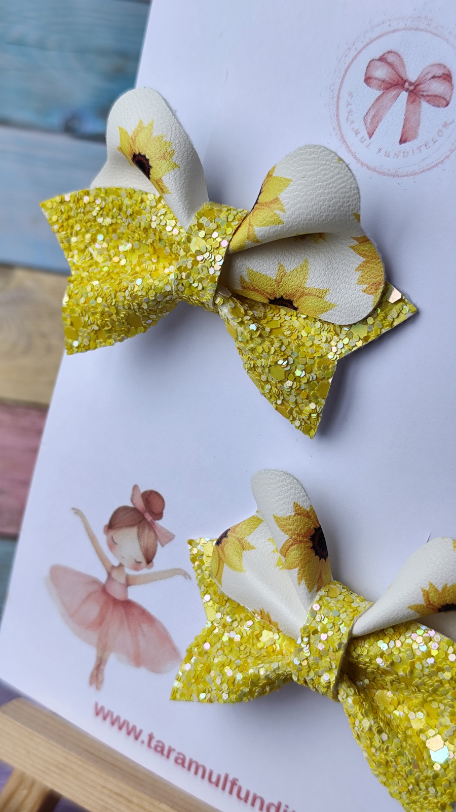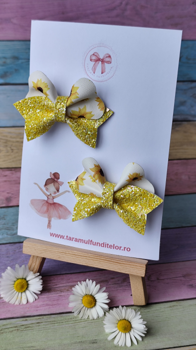 Set delicat de 2 fundițe , realizate din piele ecologica de calitate si glitter textil, cu imprimeu vesel cu floarea soarelui – ideale pentru sezonul de primăvară și vara. Fiecare fundiță este atent lucrată și atașată pe clips tip aligator, fiind ușor de prins și confortabil de purtat.