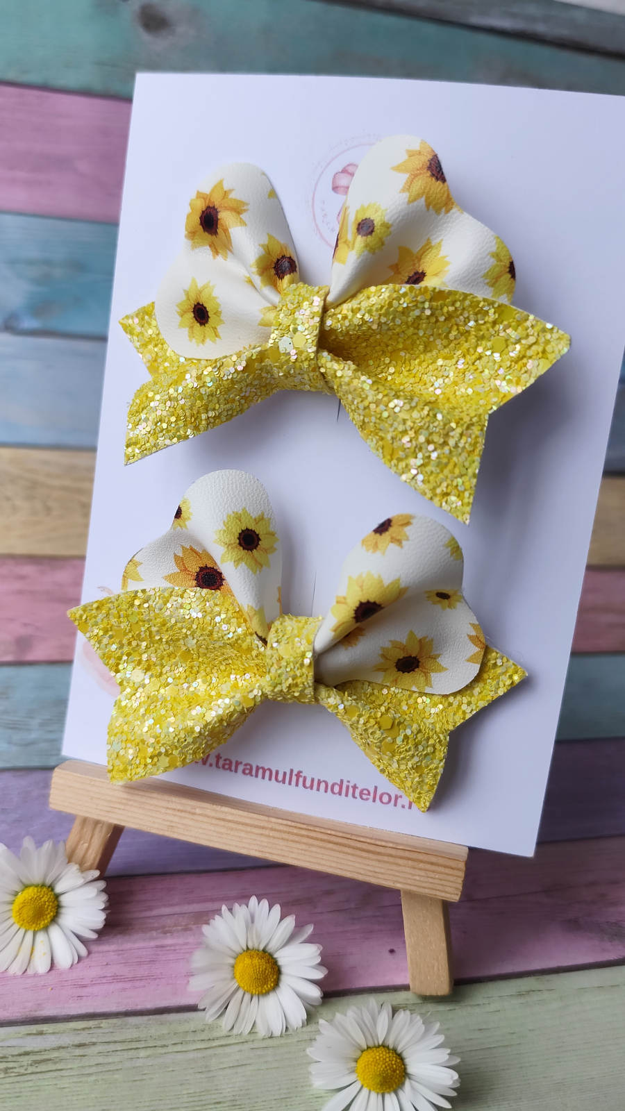 Set delicat de 2 fundițe galbene , realizate din piele ecologica de calitate si glitter textil, cu imprimeu vesel cu floarea soarelui – ideale pentru sezonul de primăvară și vara. Fiecare fundiță este atent lucrată și atașată pe clips tip aligator, fiind ușor de prins și confortabil de purtat.