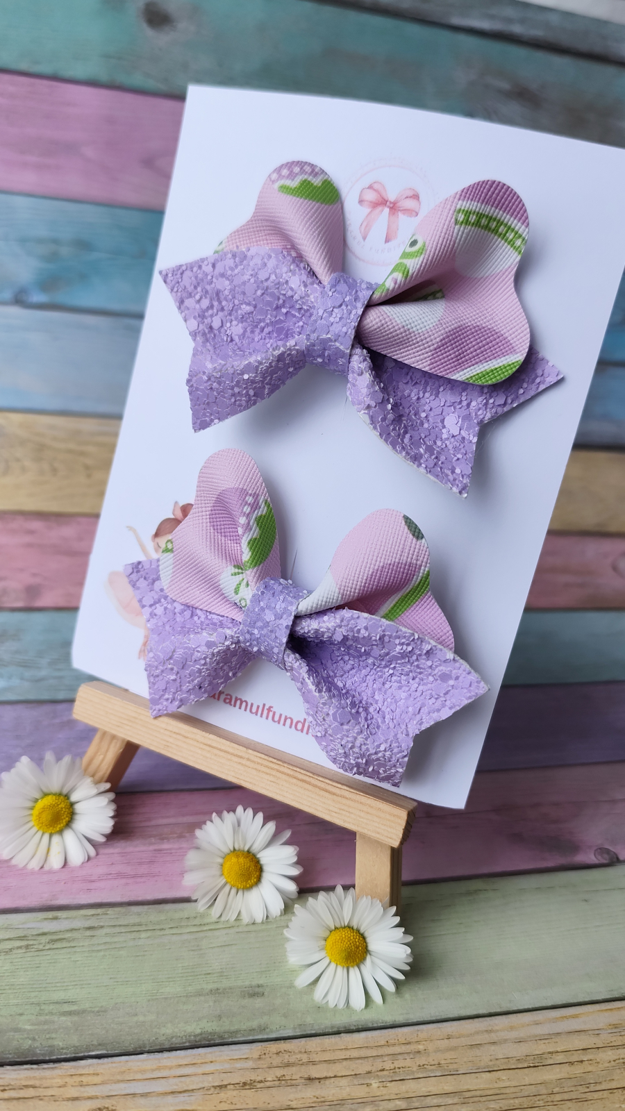 Set delicat de 2 fundițe mov, realizate din piele textilă de calitate, cu imprimeu vesel cu ouă decorative – ideale pentru sezonul de primăvară și sărbătorile pascale. Fiecare fundiță este atent lucrată și atașată pe clips tip aligator, fiind ușor de prins și confortabil de purtat.